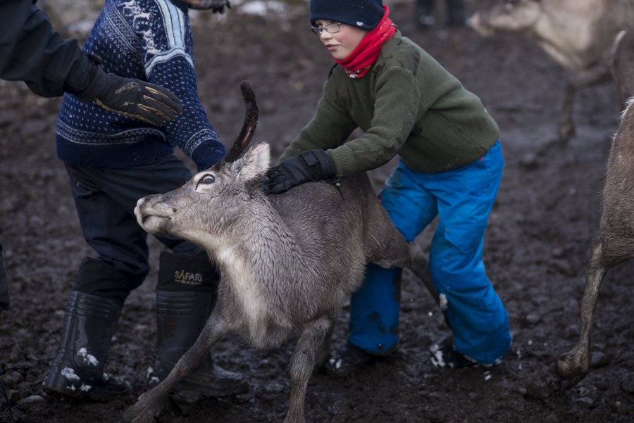 Nils Are Meløy (12) tar tak i de små hornene på reinsdyrkalven. Den spreller med beina og forsøker å komme seg løs. Men Nils Are holder kalven fast og legger den i bakken.