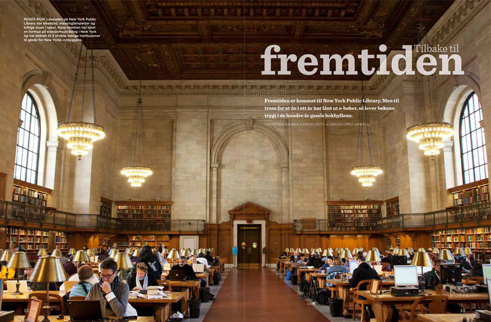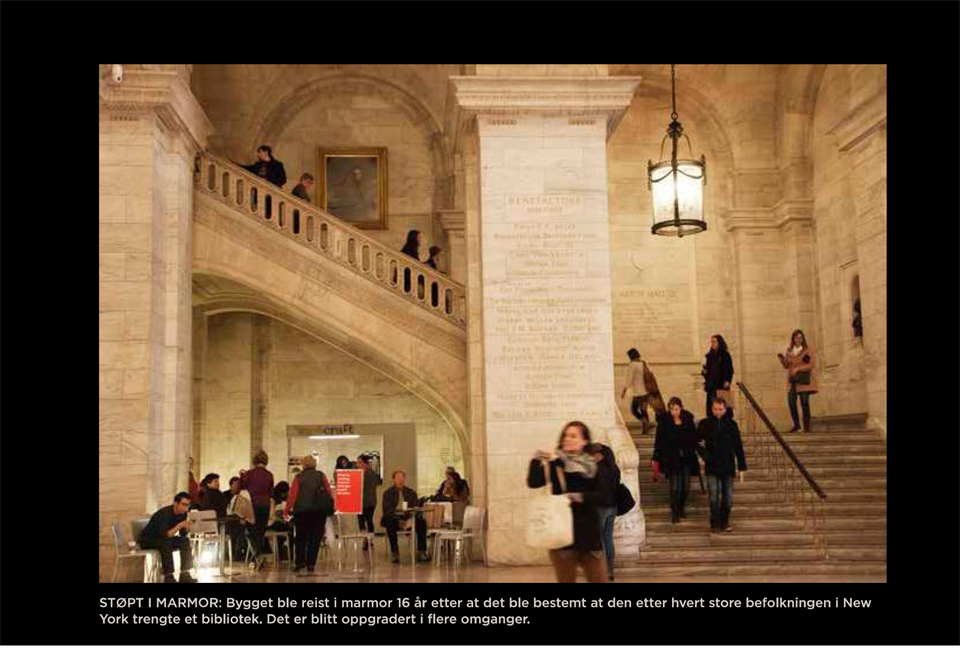 Inne på den to kvartal store lesesalen, The Rose Reading Room på New York Public Library (NYPL), har Grijulva fått en bra plass. Han klikker «Publiser» og med det har arbeidsplassen hans fortalt verden om hva som står på deres agenda i dag. På hver eneste eikepult i den store salen sitter det folk, enten med nesen i en bok eller et kart eller rett og slett bare med Facebook åpen på pc’en. I fjor gikk 17 millioner mennesker inn dørene på New Yorks bibliotek.