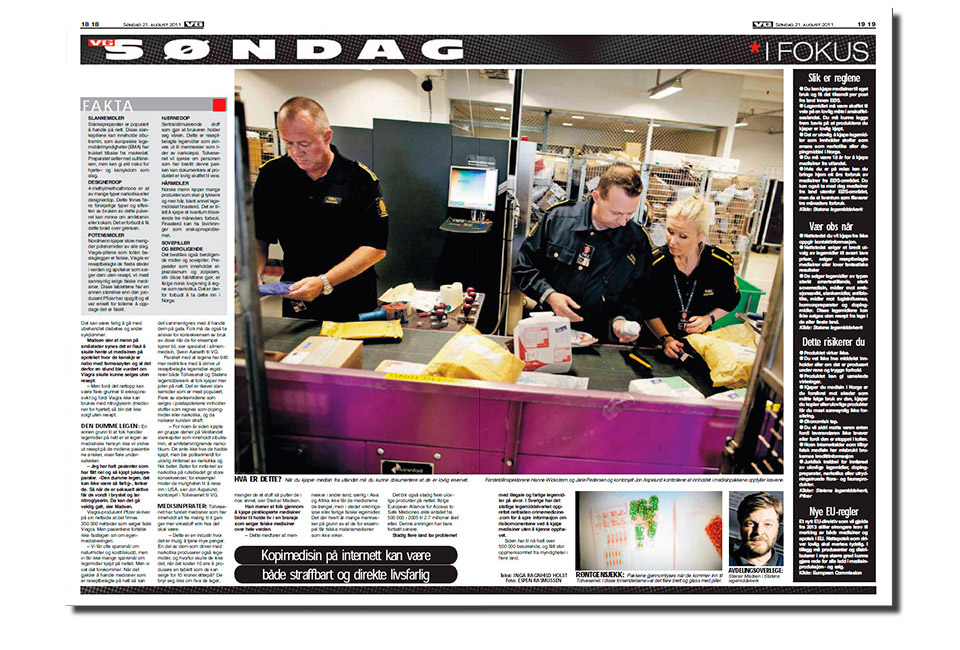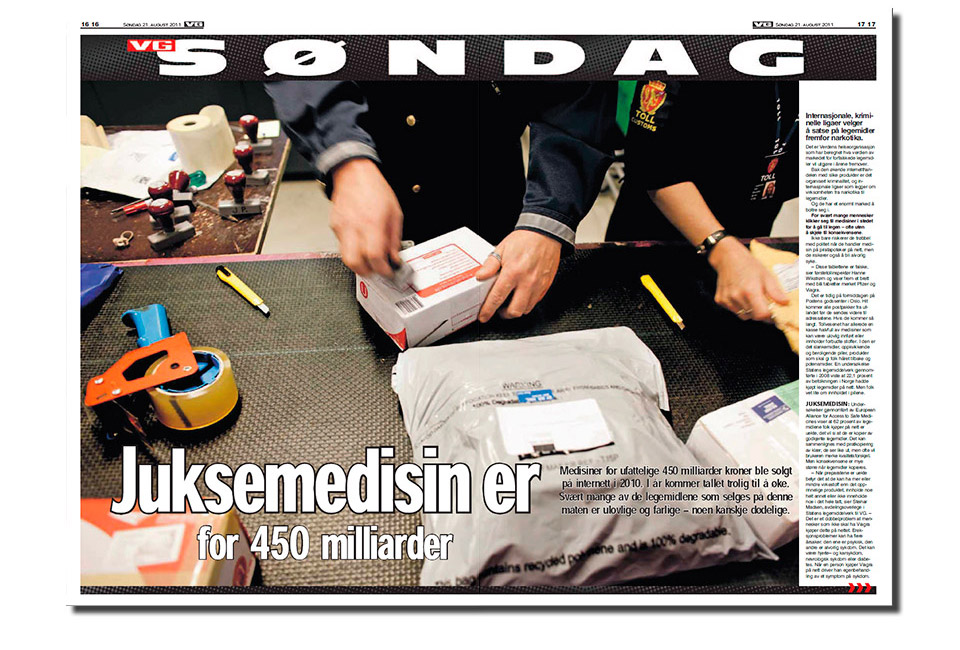 Det er tidlig på formiddagen på Postens godssenter i Oslo. Hit kommer alle postpakker fra utlandet før de sendes videre til adressatene. Hvis de kommer så langt. Tollvesenet har allerede en kasse halvfull av medisiner som kan være ulovlig innført eller innholder forbudte stoffer. I den er det slankemidler, oppkvikkende og beroligende piller, produkter som skal gi folk håret tilbake og potensmidler. En undersøkelse Statens legemiddelverk gjennomførte i 2008 viste at 22,1 prosent av befolkningen i Norge hadde kjøpt legemidler på nett. Men folk vet lite om innholdet i pillene.