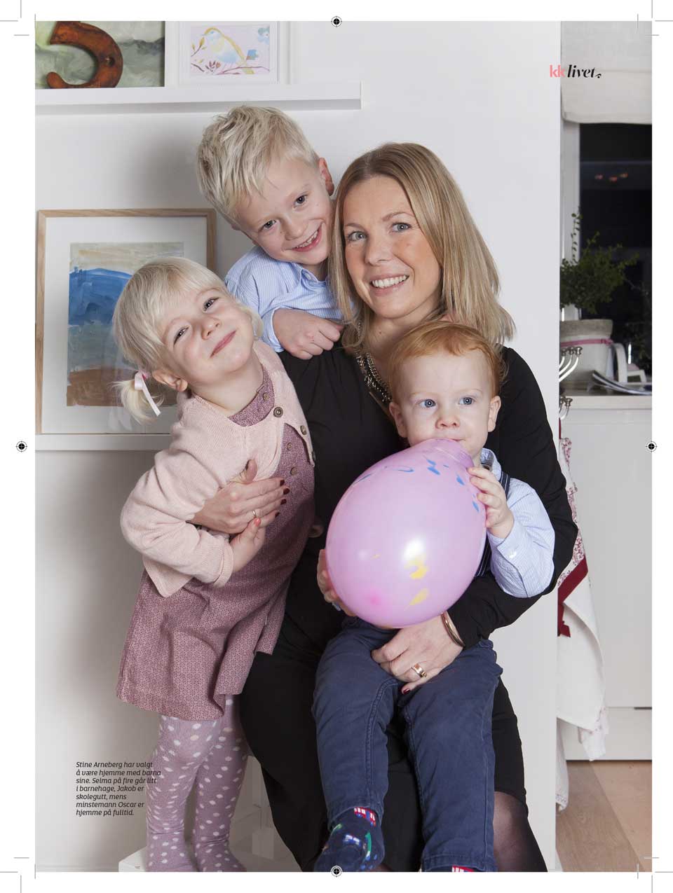 Når Stine Arneberg (34) åpner døren til sitt hvitmalte hus på Nordstrand i Oslo, dufter det herlige av nystekte boller. Rundt bena på Stine spretter tre aktive barn: Jakob (7), Selma (4) og den blide, lille rødtoppen Oskar (18 måneder). Stine er hjemmeværende, og bare Selma går i barnehage, tre til fire dager per uke. Hun kaller seg aktivist for hjemmeværende mammaer, for hun har ikke jobbet etter at hun fikk sin første gutt for sju år siden. Hun er også medlem av organisasjonen Tid for barn som jobber å styrke morsrollen. Før det jobbet hun med markedsføring og grafisk design, ja, hun startet å jobbe allerede da hun var fjorten år.