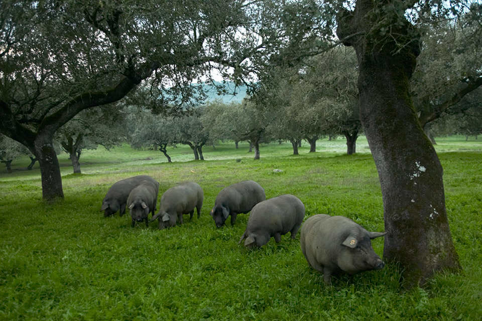 Dehesa heter dette iberiske økosystemet. De store områdene hver gris er velsignet med, gjør at grisen får nok trim til at fettet blir godt fordelt og at kjøttet får den fine, hvite marmoreringen som gir den milde, lekre smaken. For å bli tykk nok til å ende opp på finere restauranter, får de leve i to oppfetingssesonger, eller montaneras, som det heter på spansk. Montenera er høydepunktet i oppfetingen og strekker seg fra november til januar. Etter den tid er det ingen nåde for tykksakene med de berømte sorte syltelabbene som har gitt skinken navnet pata negra (svarte ben).