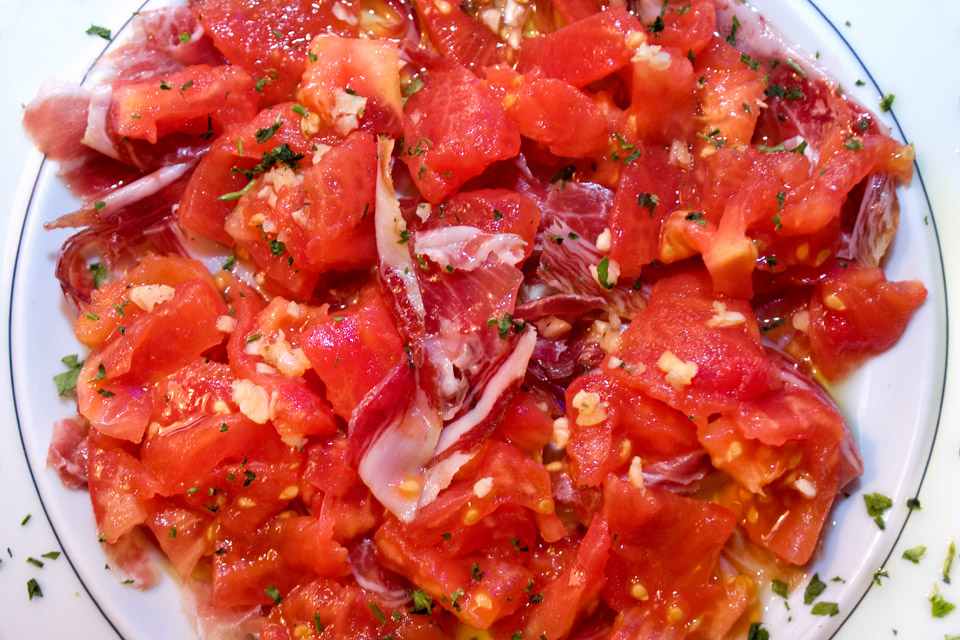 Omhyggelig skjærer han tynne, nesten gjennomsiktige skiver. Klokken er ett og baren er full av folk som vil stapper i seg ristet brød med skinke og skyller det ned med øl eller vin mens de gleder seg til middag.