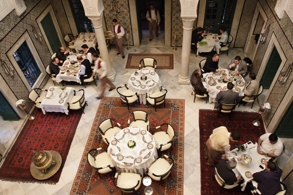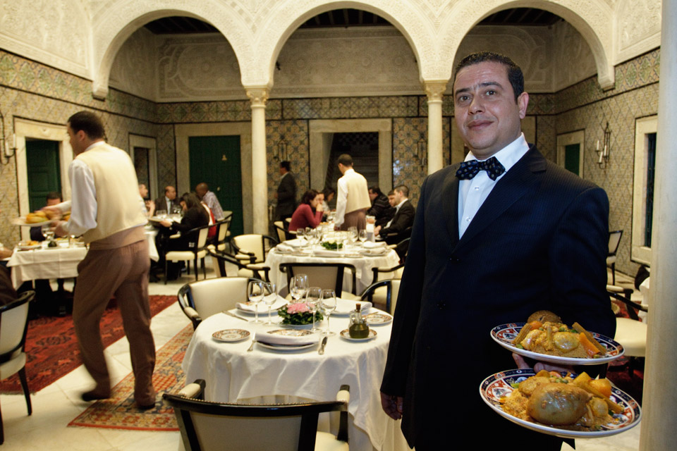 ALLER FINEST: Det er til Dar El Jeld i Tunis landets president gjennom nesten 30 år, Zine El Abidine Ben Ali, tar med seg sine gjester på middag. Gjesteboken sladrer om gjester som Catherine Deneuve og Jacques Chirac, ja selv Spanias konge og dronning har spist husets harissa (chilisaus). 70 personer jobber her og de hvite liljene strutter i vasene uten så mye som et halvbrunt fiber i stilkene. Det er vakre knyttede tepper på gulvene og arabiske motiver i maleriene, men spanske Andalucía går tydelig igjen i de fargerike flisene på veggene og i utskjæringene i bindingsverket.