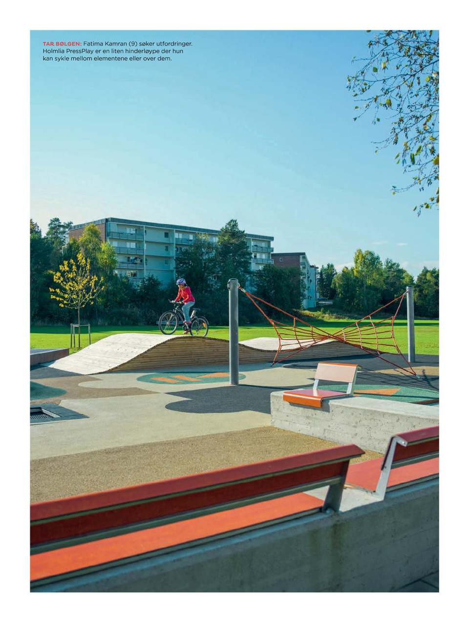 Et nanosekund etterpå lander han stilfullt på et mykt underlag. På Holmlia i bydel Søndre Nordstrand i Oslo er det bygget en ny lekeplass hvor barna samler seg og klatrer, sykler og svinger. Holmlia PressPlay heter plassen, som ble åpnet i vår. Den ligger i Lusetjerndalen midt mellom to av bydelens skoler.