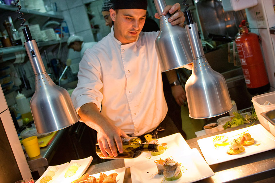 OLIVENTÅR: Olivenoljen er fast innslag i det kanariske kjøkkenet, så også på Los Roques på Tenerife. Chef Juan Guil fra Sevilla i fastlands-Spania tilbereder de forseggjorte rettene under varmelamper.