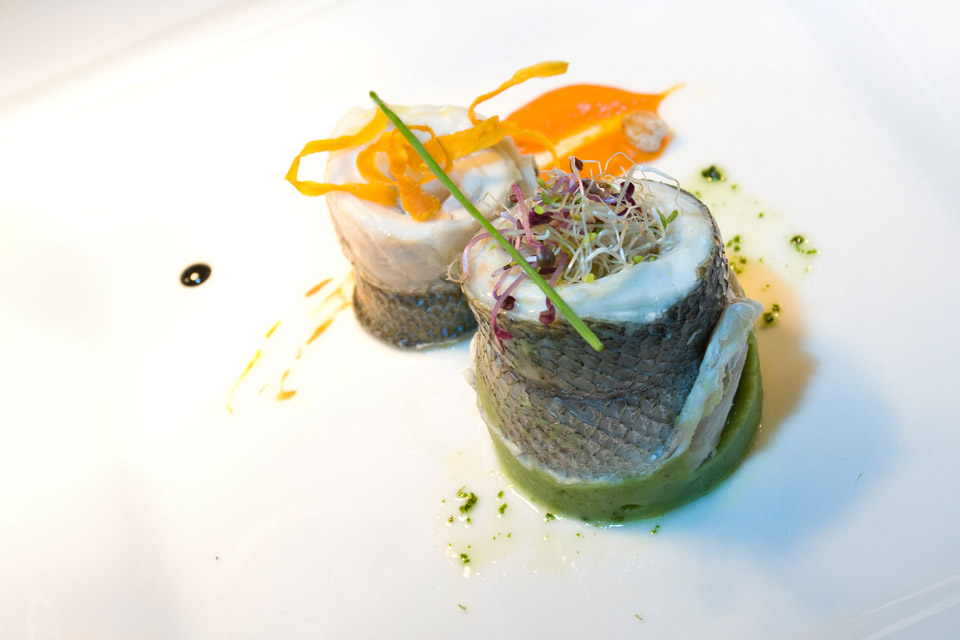 KOMPOSISJON: En havabborfilet og en doradofilet i to spiraler, erter, timian og et strø av limeskall. Ganske elegant, ikke sant?