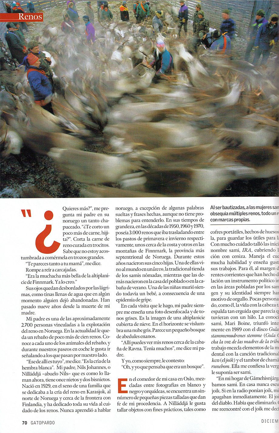 ”Resultaba muy emocionante participar en el traslado de los renos desde la montaña hasta la costa. En muchas ocasiones, siempre que la nieve estuviese dura, viajábamos toda la noche, y durante el día dormíamos. Vivíamos en tiendas, a pesar de que la temperatura muchas veces alcanzaba los 20 e incluso hasta los 30 grados bajo cero. Algunas veces corríamos peligro, como en aquella ocasión en que por un repentino aumento de la temperatura, se rompió el hielo, hundiéndose así nuestro trineo en el agua.”